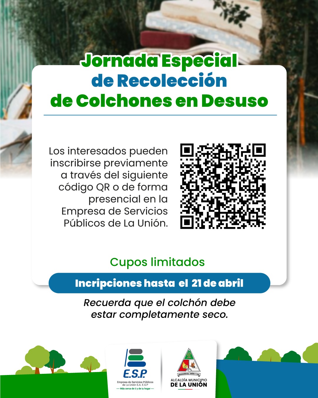 ¡Aprovecha esta oportunidad para reciclar tus colchones viejos de manera responsable! Requisitos: Inscribirte previamente en la oficina de la Empresa de Servicios Públicos o en el siguiente link https://docs.google.com/…/1FAIpQLSdGf6ieqdt…/viewform… Asegúrate de que el colchón esté totalmente seco. Inscríbete máximo hasta el 21 de abril. Contribuyamos juntos al cuidado del medio ambiente. Navegación de entradas Seguimos cerca de nuestra comunidad