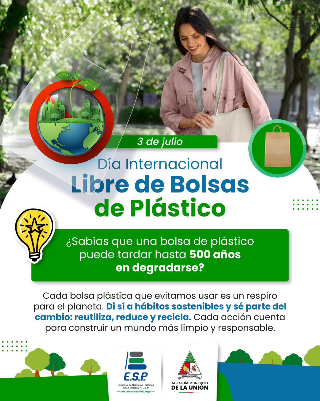 Pequeñas acciones generan grandes cambios: lleva tu bolsa reutilizable y aporta a un municipio y un planeta más limpio y sostenible.