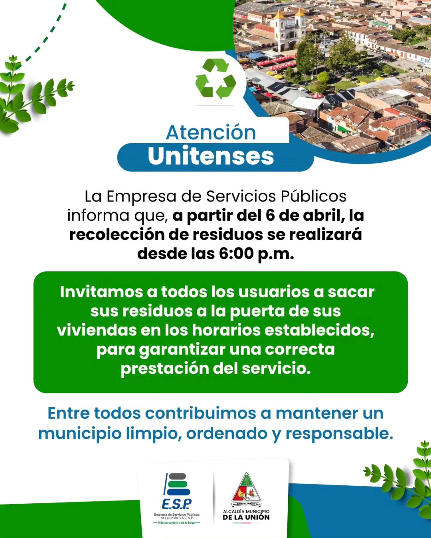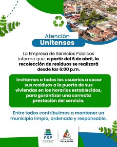 A partir de este lunes 06 de abril cambia nuestro horario de recolección de residuos. Por eso, te invitamos a sacar tus residuos a partir de las 6:00 p.m. Cuidar nuestros espacios es compromiso de todos ¡Contamos contigo para mantener limpio nuestro municipio! Navegación de entradas Ayer acompañamos a la comunidad en el desfile del Santo Sepulcro, viviendo juntos un momento de fe y recogimiento. ¡Seguimos trabajando por un municipio más limpio!