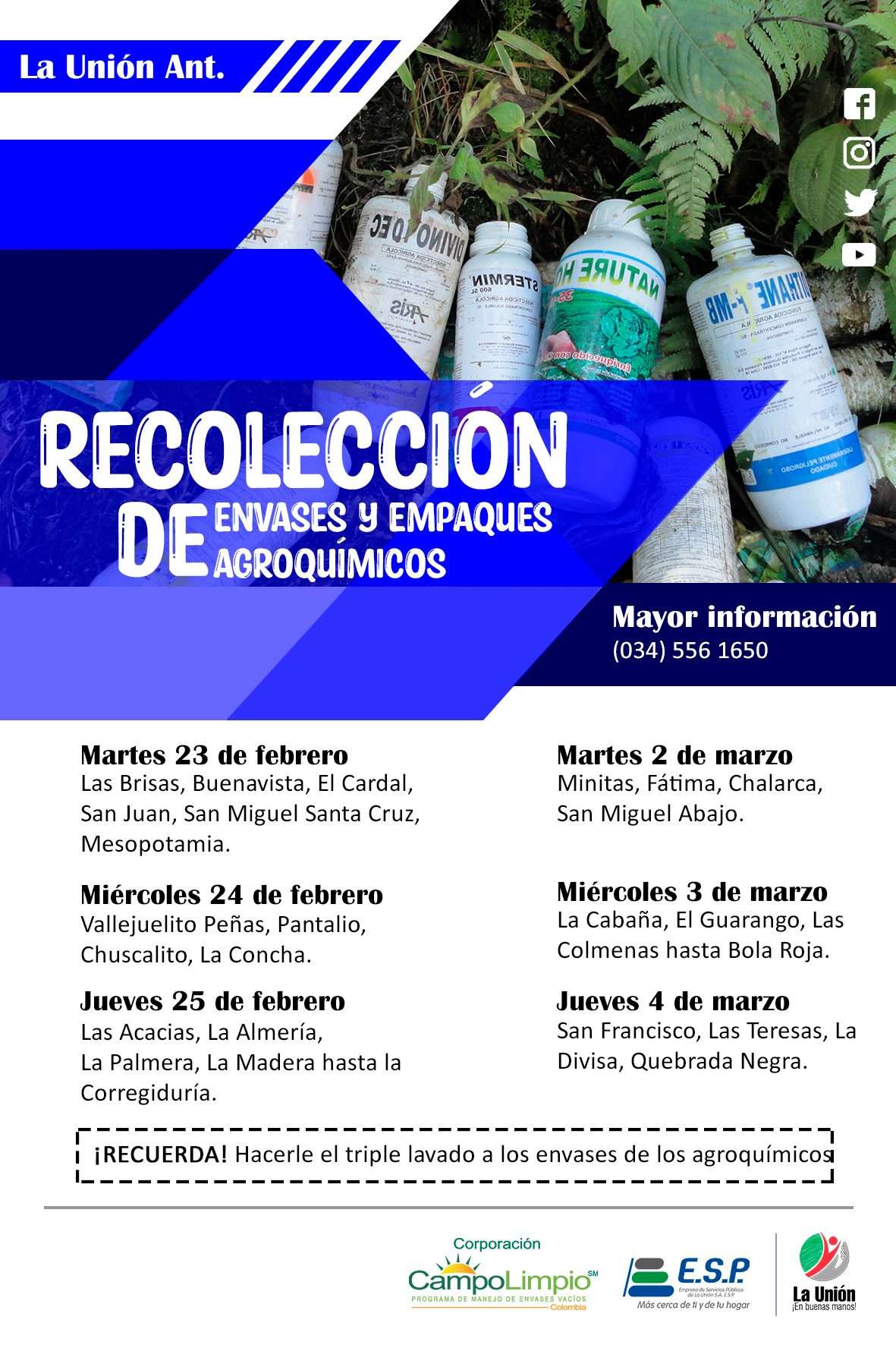 Informamos a la comunidad, que iniciaremos con la recolección de envases agroquímicos, dicha colecta será distribuida en tres días, 23, 24 y 25 de febrero; 2, 3 y 4 de marzo.