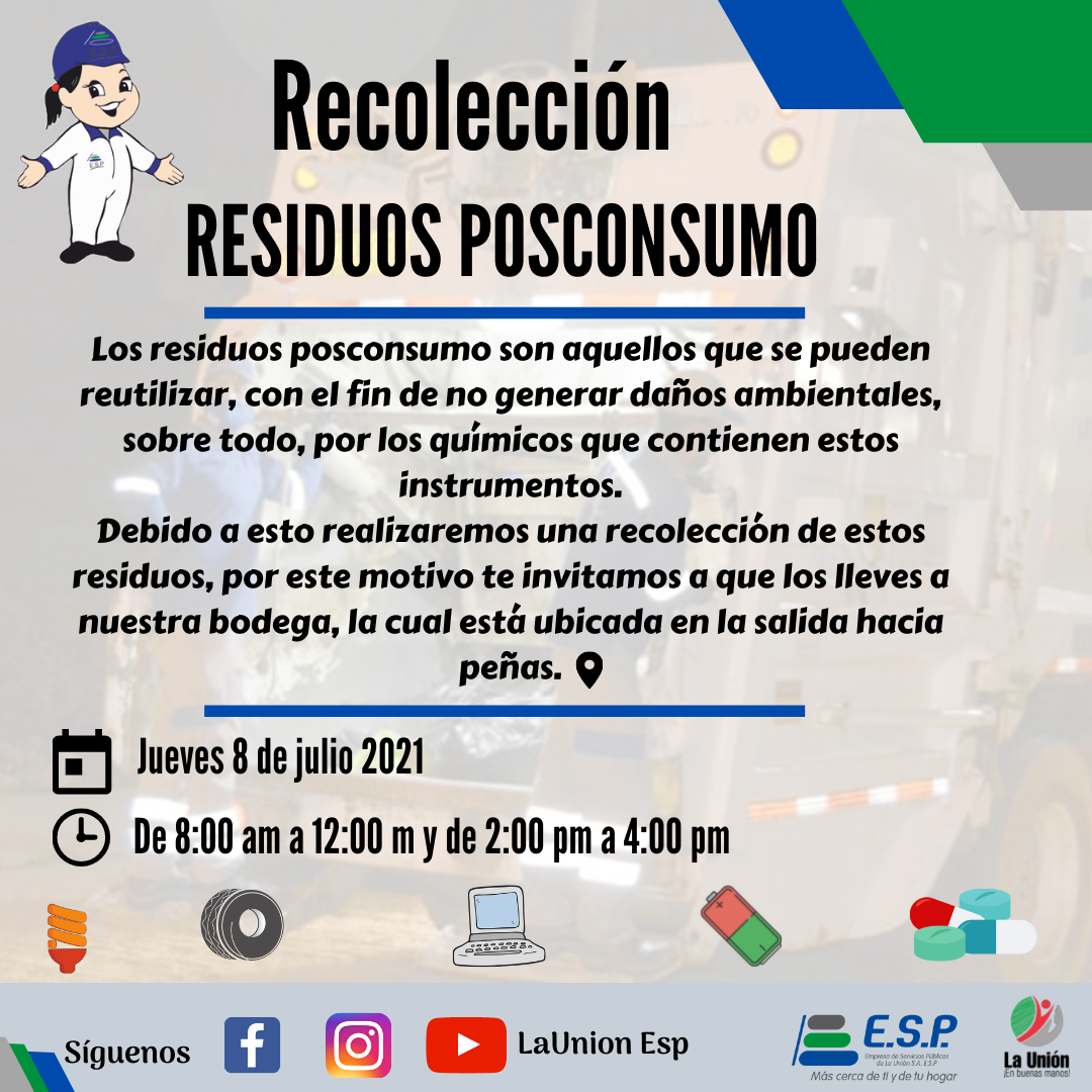 El próximo jueves 8 de julio , estaremos realizando la jornada de recolección de residuos posconsumo, con el fin de seguir aportando cuidados a nuestro planeta.