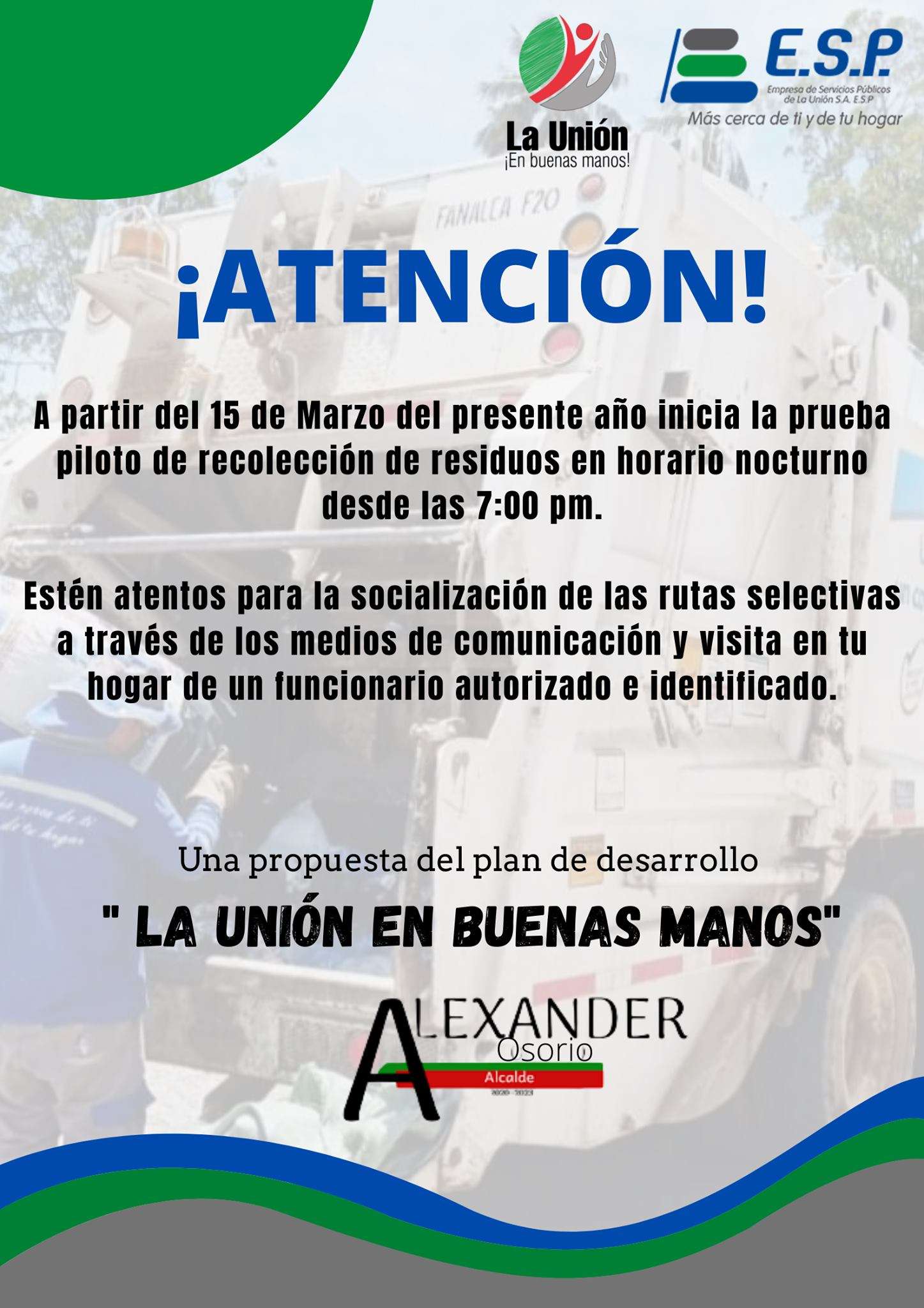 La Empresa De Servicios Públicos La Unión S.A. E.S.P., informa que iniciará la recolección de residuos nocturna, espera la socialización de las rutas selectivas. La ESP, más cerca de ti y de tu hogar. Navegación de entradas TALLER DE MANUALIDADES NOS CUIDAMOS PARA CUIDARTE